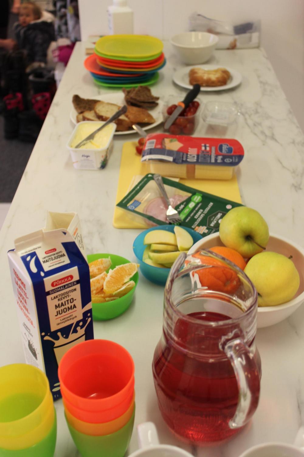 Tarjolla kahvia, teetä ja pientä aamupalaa.